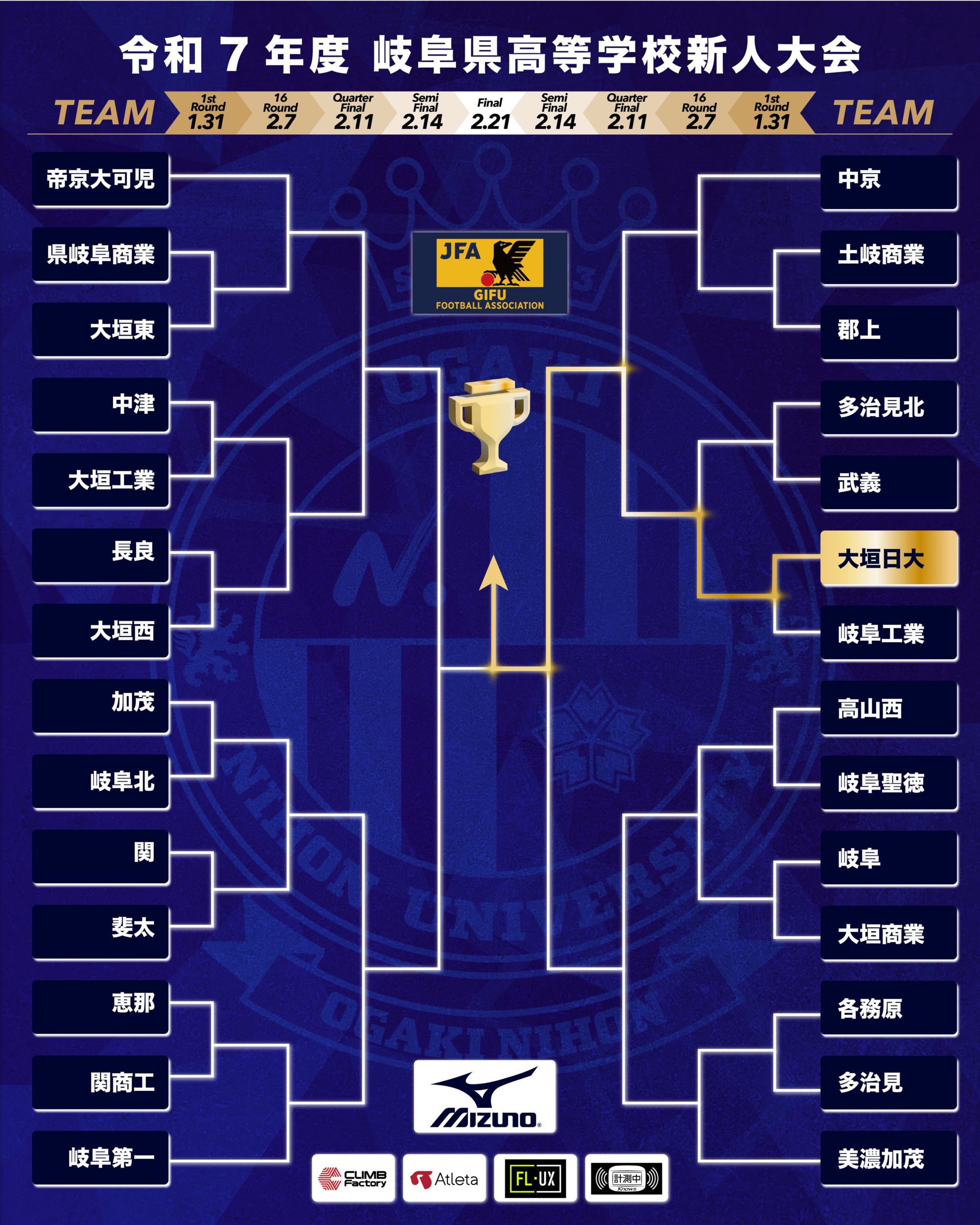 令和7年度 岐阜県高等学校新人大会組合せ 2026年1月28日 最終更新日時 : 2026年1月28日 onusoccer 令和7年度 岐阜県高等学校新人大会の組合せ及び試合情報をお知らせいたします。 1回戦 日 程令和8年1月31日(土)時 間14:00 kickoff対戦相手岐阜工業会 場中池グリーンフィールド 組み合わせ Follow me! @soccer_onu FacebookXBluesky